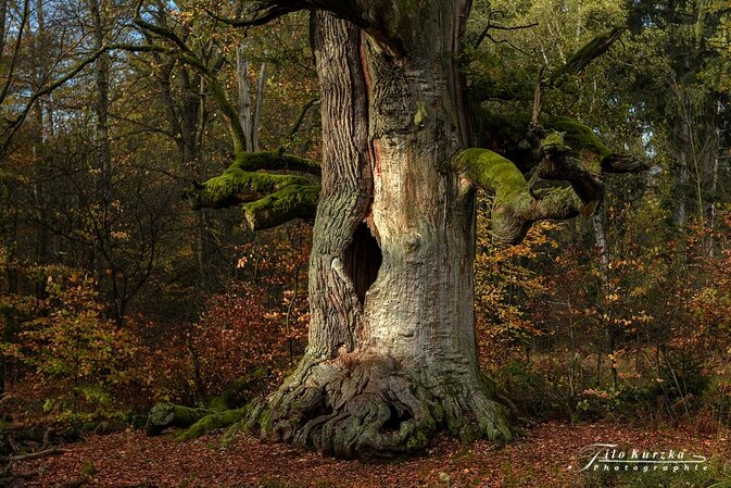 Etwa eine Autostunde von mir entfernt, mitten im Reinhardswald, in der Nähe der Sababurg, liegt der Urwald Sababurg. Seit etwa 1907 wird die Waldfläche des heutigen Urwaldes nicht mehr bewirtschaftet und steht seitdem unter Naturschutz. Somit ist der Urwald Sababurg das älteste Naturschutzgebiet in Hessen. Auf einer Fläche von ca. 90 ha stehen neben Buchen auch Alteichen, die eine außergewöhnliche Größe erreicht haben. Zu den bekanntesten Bäumen des Urwald Sababurg gehören die „Kamineiche“ und die „Wappeneiche“ mit einem Umfang von jeweils weit über 7m. Mit ihrem Alter, der Form und ihrer Größe, gehören die beiden Eichen zu den meistfotografierten Bäumen in Deutschland.